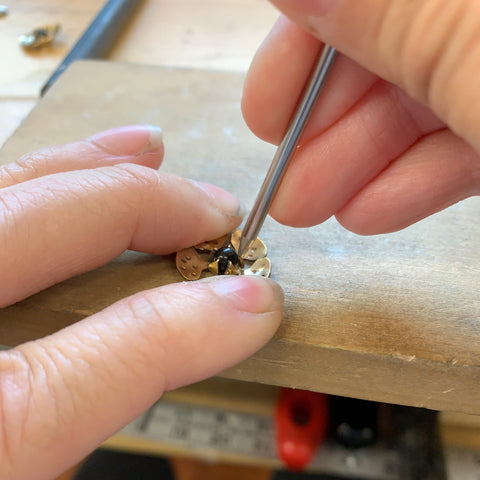 Today I want to share the process with you and to show that sometimes designs look deceptively simple, yet are actually quite work intensive. This is what you get when you buy handmade, dedication and love of the craft. It takes years to build the skill and collect the necessary tools to create with. You get a lot of hard work for the money. In this case, these pieces all hover around the $30 price point. Pictured above are a couple behind the scenes shots, and the finished product. Below I created a list of the many steps it makes to create these little flower pieces as a way to describe the process and help you understand what goes into creating a piece of wearable art.